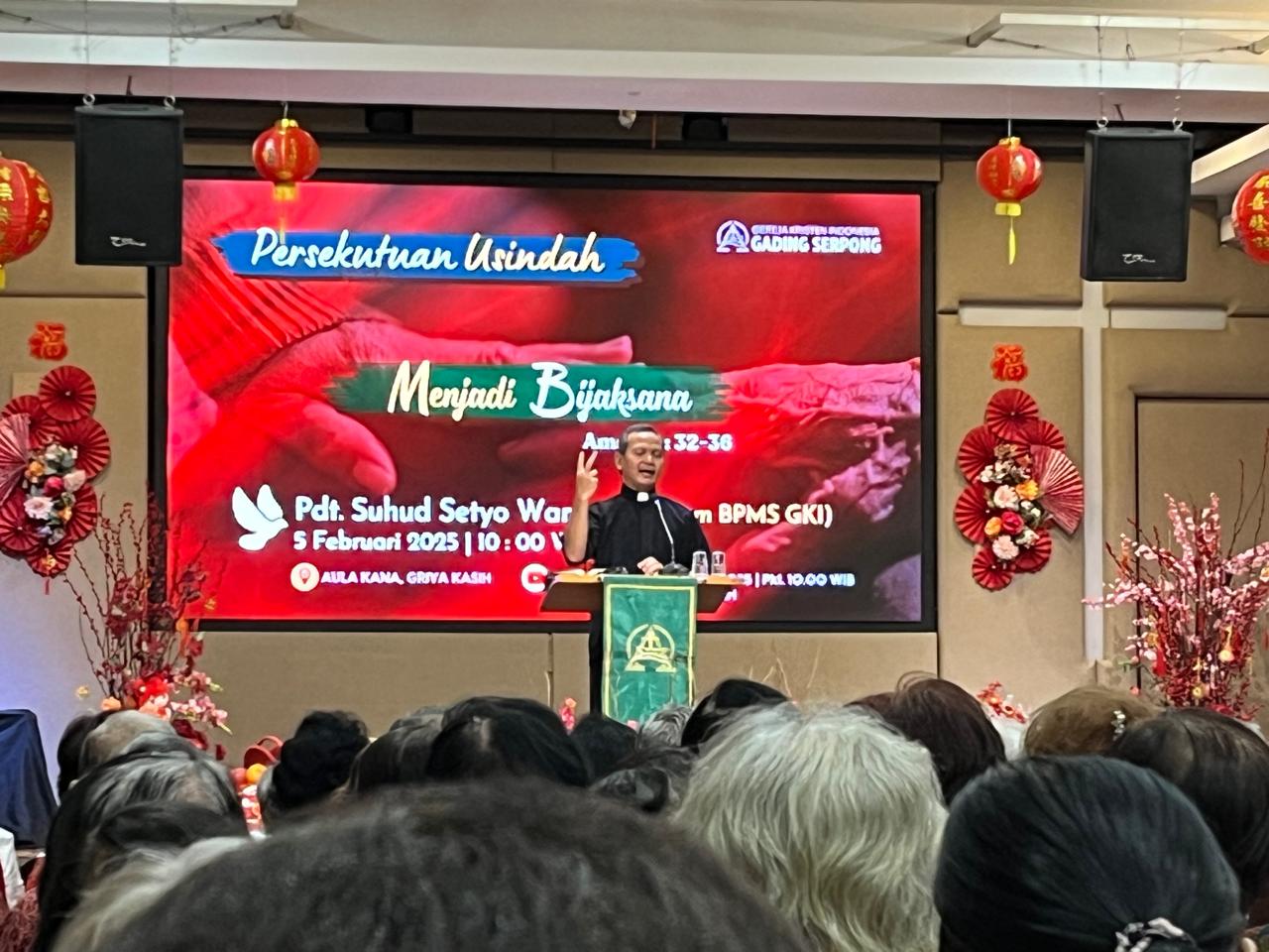 Rabu, 5 Febuari 2025, Komisi Usia Indah GKI Gading Serpong mengadakan persekutuan Imlek di ruang Kana, Griya Kasih, Jl. Kelapa Gading Barat, Pakulonan Barat, Kecamatan Kelapa Dua, Kabupaten Tangerang, Banten. Acara dimulai pukul 10.00 WIB. Sejak pagi, para pengurus terlihat sibuk sekali. Pukul 07.30, beberapa pengurus sudah hadir, untuk menyelesaikan menghias ruangan dengan dekorasi bernuansa Imlek. Setelah itu, semua pengurus berikut Pdt. Erma Primastuti Kristiyono dan Pnt. Toba Parluhutan Sitorus berlatih mengucapkan “Gongxi gongxi, gongxi da jia. Xin nian kuai le, shen ti jian kang, wan shi ru yi, yuan zhu meng en,” yang akan diucapkan kepada jemaat pada acara perayaan Imlek, sesudah persekutuan selesai.