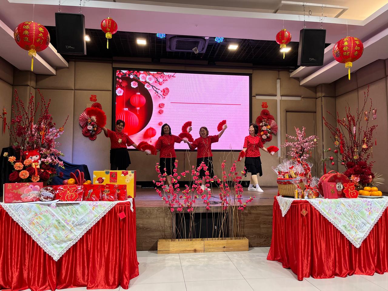 Setelah doa berkat dari Pdt. Suhud, acara dilanjutkan dengan perayaan. Pdt. Erma dan Linda bertindak sebagai pembawa acara, mengajak jemaat menyanyikan lagu “Mari Kita Bersukacita”, dilanjutkan dengan ucapan selamat Tahun Baru Imlek dari seluruh pengurus berserta Pdt. Erma dan Pnt. Toba. Jemaat begitu bersukacita membalas ucapan tersebut. Helena Ocha dan teman-teman mempersembahkan tarian, diiringi musik bernuansa Mandarin. Mereka membawakan tari kipas dengan luwes.
